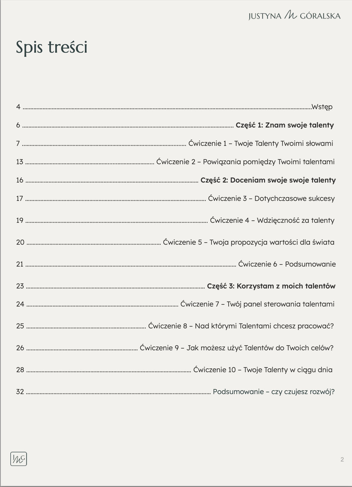 Dzięki starannie dobranym ćwiczeniom zyskasz nie tylko głębsze zrozumienie swoich talentów, ale także nauczysz się, jak skutecznie używać ich w pracy lub życiu codziennym – wszędzie tam, gdzie ich potrzebujesz.